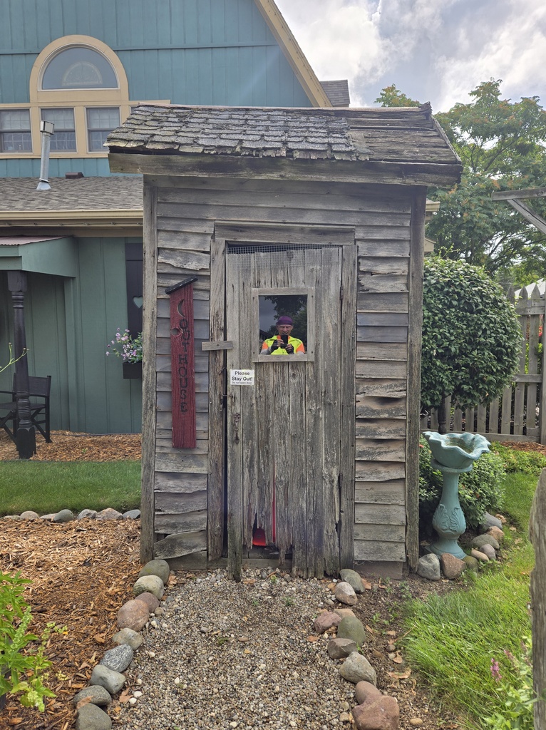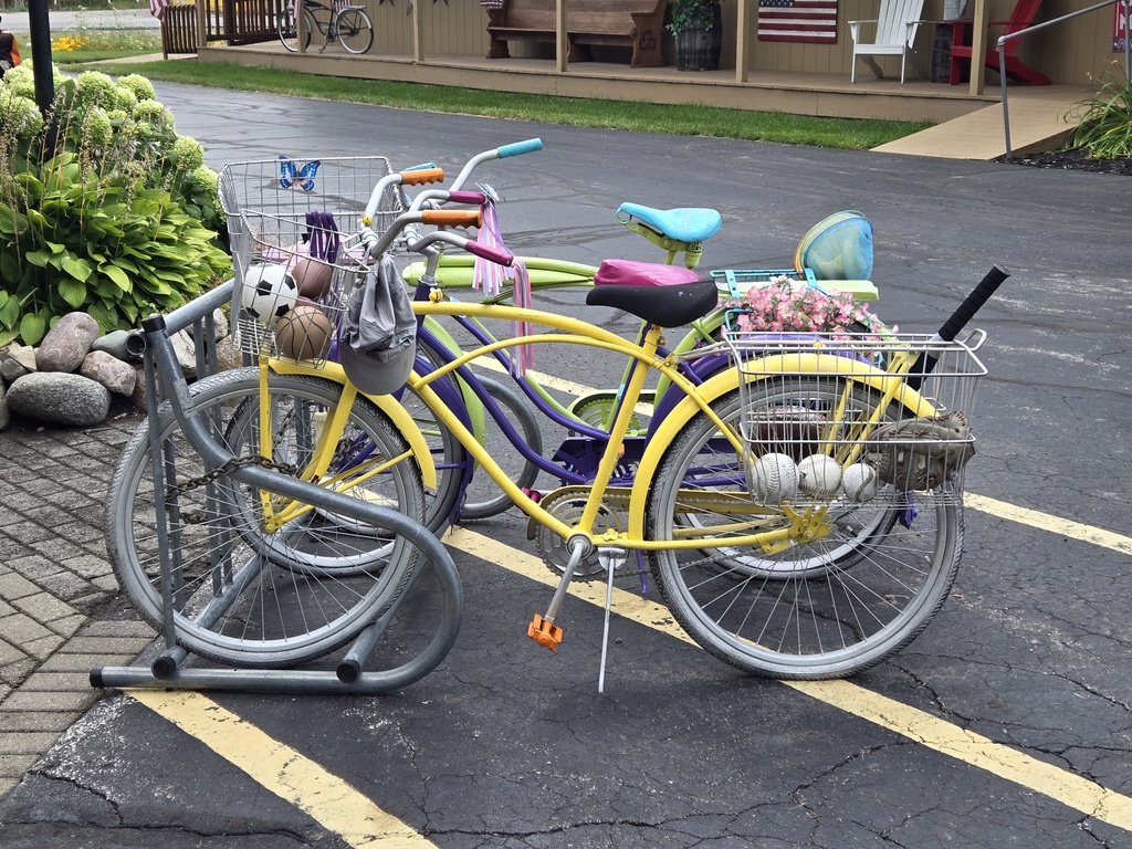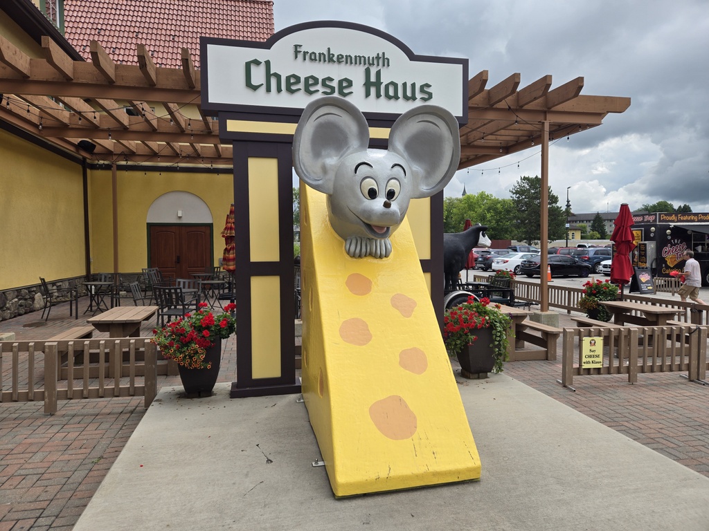 We stopped after a little over 30 miles at a funky deli, garden, knick-knack shop. Even though the roads were dry and we’d been riding without raingear for a while, we still felt pretty sticky. We had snacks and began working on plan B lodging options for the night. There were lots of black clouds around and the odd spot of rain, plus more thunderstorms were forecast. We agreed to stop in Frankenmuth, about 18 miles short of our planned ride, to have a look at hotels. We were planning on staying at Otter Lake city campground but the thought of camping with storms all about and then camping was not sounding fun. The choices were to stop 18 miles short or ride 18 miles past our intended destination. Tomorrow’s forecast is brighter so we put the priority on finding a place in Frankenmuth higher.