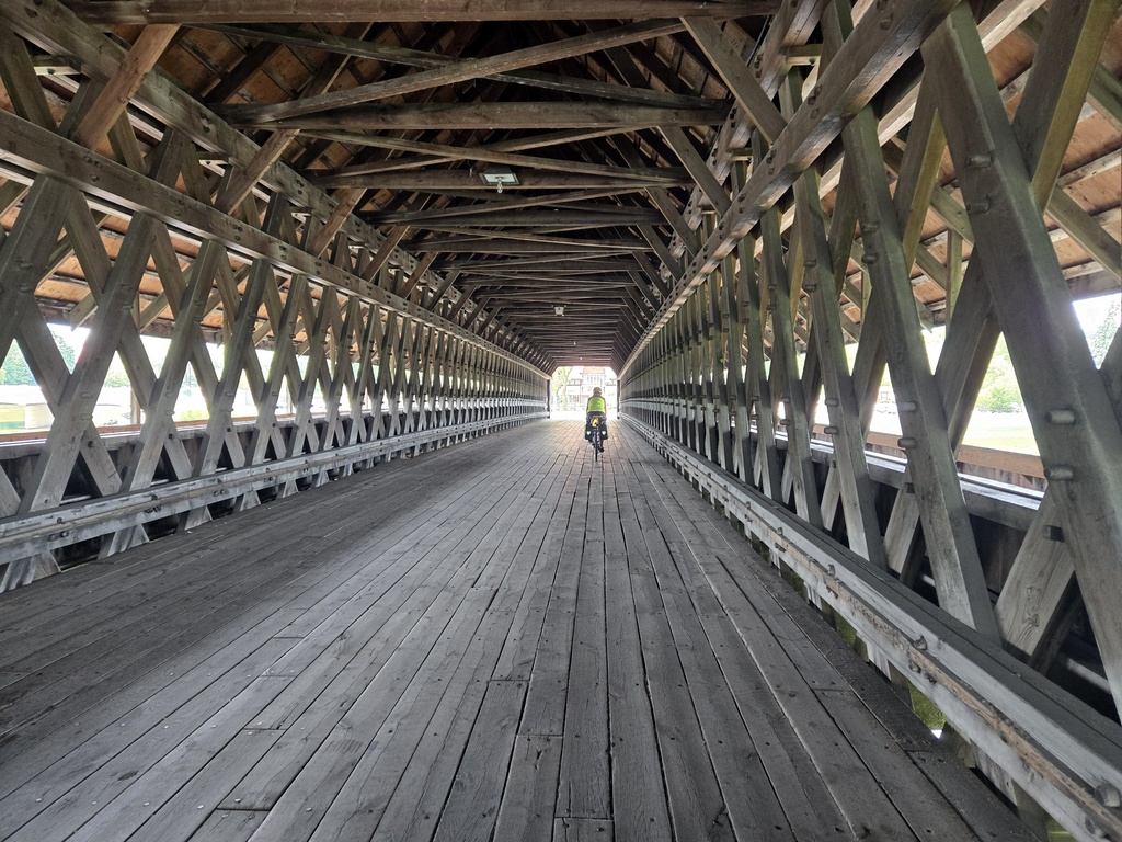 We followed Komoot and Michigan’s idea of a cycleway for most of the day. In town and for the first 20 miles there were nice cycleway signs, lots of traffic and virtually no shoulder. I’m not sure why they call it a cycle way, other than the signs. The one silver lining was very well behaved traffic. Everyone gave us lots of room and passed with a relative high degree of care. Perhaps, the signs did this. Maybe people just felt sorry for us in the rain. After about 20 miles, the rain stopped and we could remove our rain coats. It was 69 degrees when we left the hotel and probably over 80 by the time we took the coats off. I think we were just as wet from sweat as we were rain.