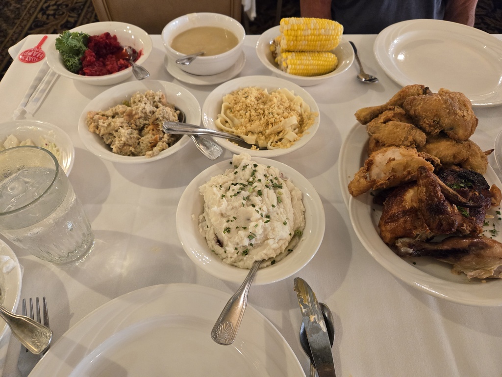 We had to walk 10 minutes back through “little Bavaria” for dinner at Zehnder’s Frankenmuth where we had their self declared Famous Chicken. We had the “standard” dinner which was basically all-you-can-eat Thanksgiving dinner with chicken instead of turkey. Everything was tasty but just like on Thanksgiving itself, we all ate a bit too much. I’m sure glad we have 80ish miles to ride tomorrow.