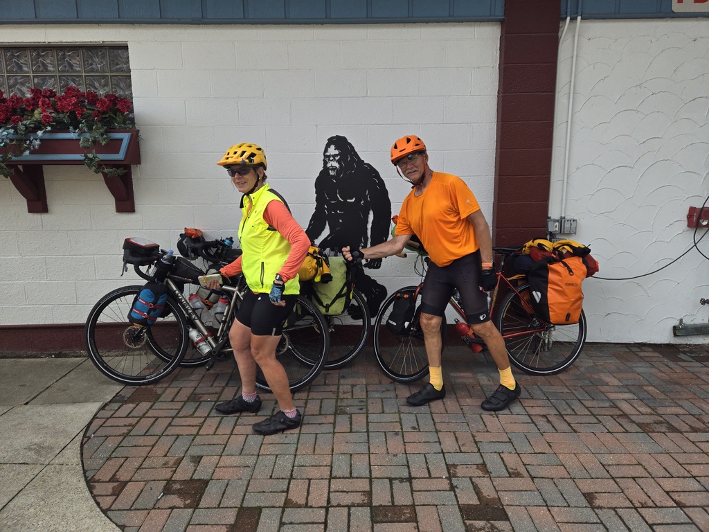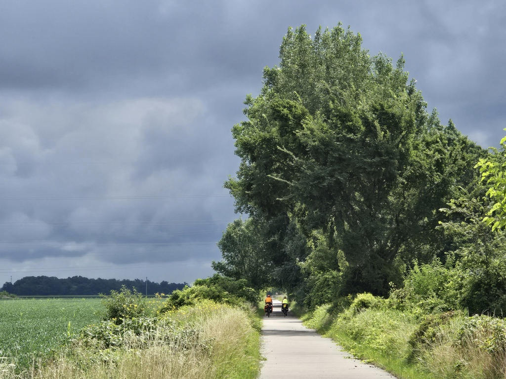 We followed Komoot and Michigan’s idea of a cycleway for most of the day. In town and for the first 20 miles there were nice cycleway signs, lots of traffic and virtually no shoulder. I’m not sure why they call it a cycle way, other than the signs. The one silver lining was very well behaved traffic. Everyone gave us lots of room and passed with a relative high degree of care. Perhaps, the signs did this. Maybe people just felt sorry for us in the rain. After about 20 miles, the rain stopped and we could remove our rain coats. It was 69 degrees when we left the hotel and probably over 80 by the time we took the coats off. I think we were just as wet from sweat as we were rain.