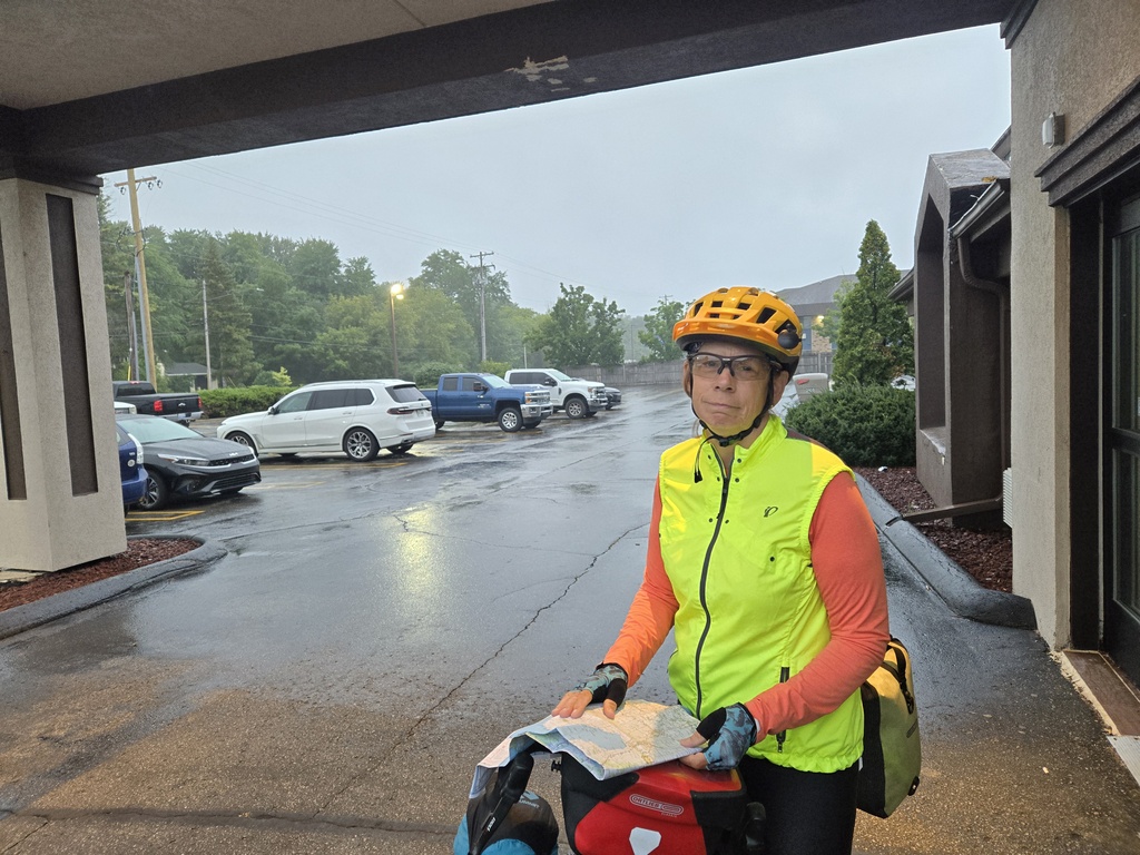 Wow, what a crazy day. Rain was forecast throughout the day but it wasn’t supposed to get heavy until around noon. Well, the weatherman blew that one. We exited the hotel to sprinkles at 7AM and watched the rain build. I’m not sure it helped but Chris was slower, coming out a bit later into what now was a right downpour. We mucked about getting our rain gear on and eventually pulled way about 7:30AM. It was still raining pretty good and it would continue this way for about an hour.