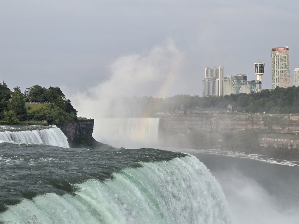 On the USA side, in the town of Niagara Falls, it was a completely different story. The first couple blocks were sort of tired touristy, and then the city proper started. We stopped at a little cafe on the USA side for brekkie and noticed that we could sort of see American Falls from our outside table. We decided to ride down to have a look and ended up right at the top of American Falls where it goes over the cliff. “They” are correct in saying that the view of Niagara Falls is better from the Canadian side but the impact of being right at the top of American Falls was very dramatic. It certainly answered Chris’s question as to whether you could survive going over the falls in a barrell – the answer is no! It was great being at the falls before hordes of people turned up.