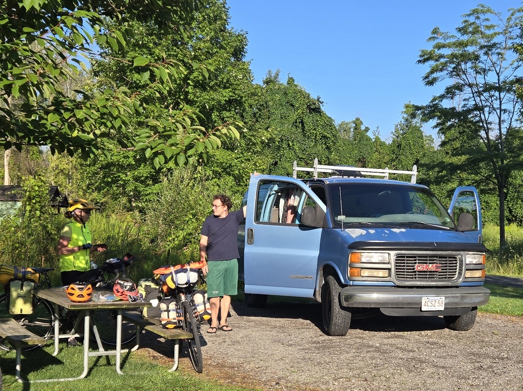 Today everyone was ready to leave camp. Andrea and Will were heading west towards Oregon. Jim, Kayrl and Jacob were heading west to Niagara Falls (then east back to join us). And finally us, we were heading east on the Erie Canal towpath. Skies were clear and blue, what a nice change over our rest day. To make sure that everyone had appropriate energy levels for the day, Jim grilled up a nice brekkie. Cooking for eight in a campground is not easy, though Jim makes it look that way.