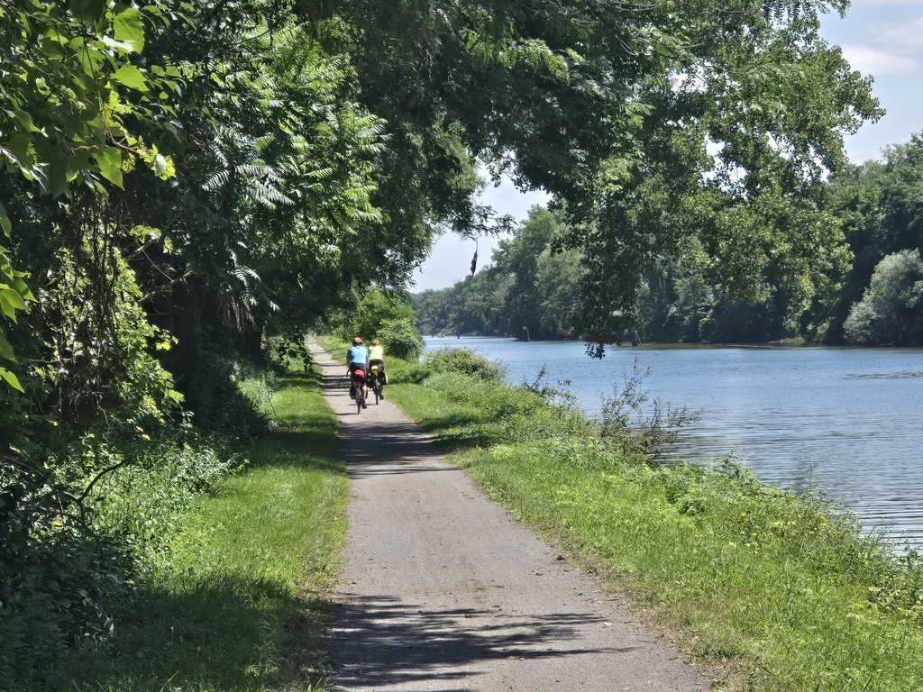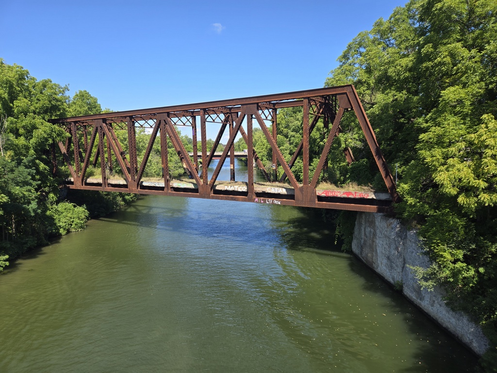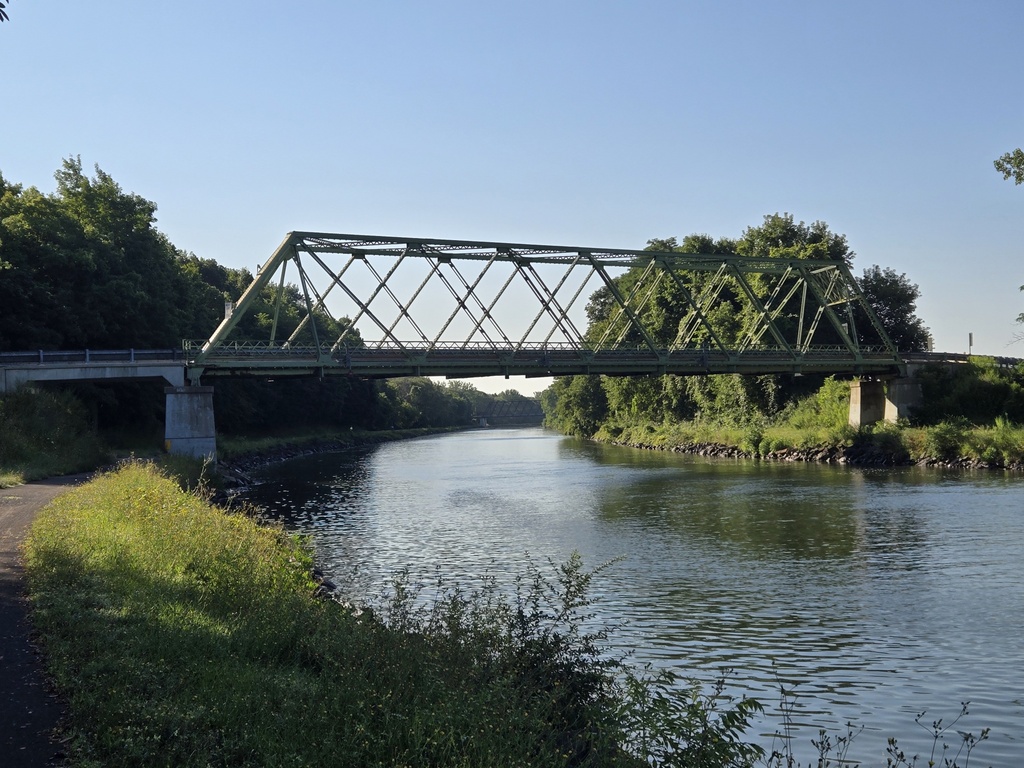 Our second day on the canal was more or less the same as the first day for the first 20 miles and for the last 20 miles. That is, lots of crop fields or forest lots on one side, the canal on the other. There may be a few more bridges on this section but it’s hard to say. We had a little more pavement but mostly the surface continued to be crushed stone. The middle 20 miles we rode through the city of Rochester, a city with about 200,000 folks. We left the canal a little bit more, had to ride through some light industry and past the airport. The canal routing folks did a nice job keeping us out of traffic and away from danger. We only had to cross a couple busy roads but never had to ride on any.