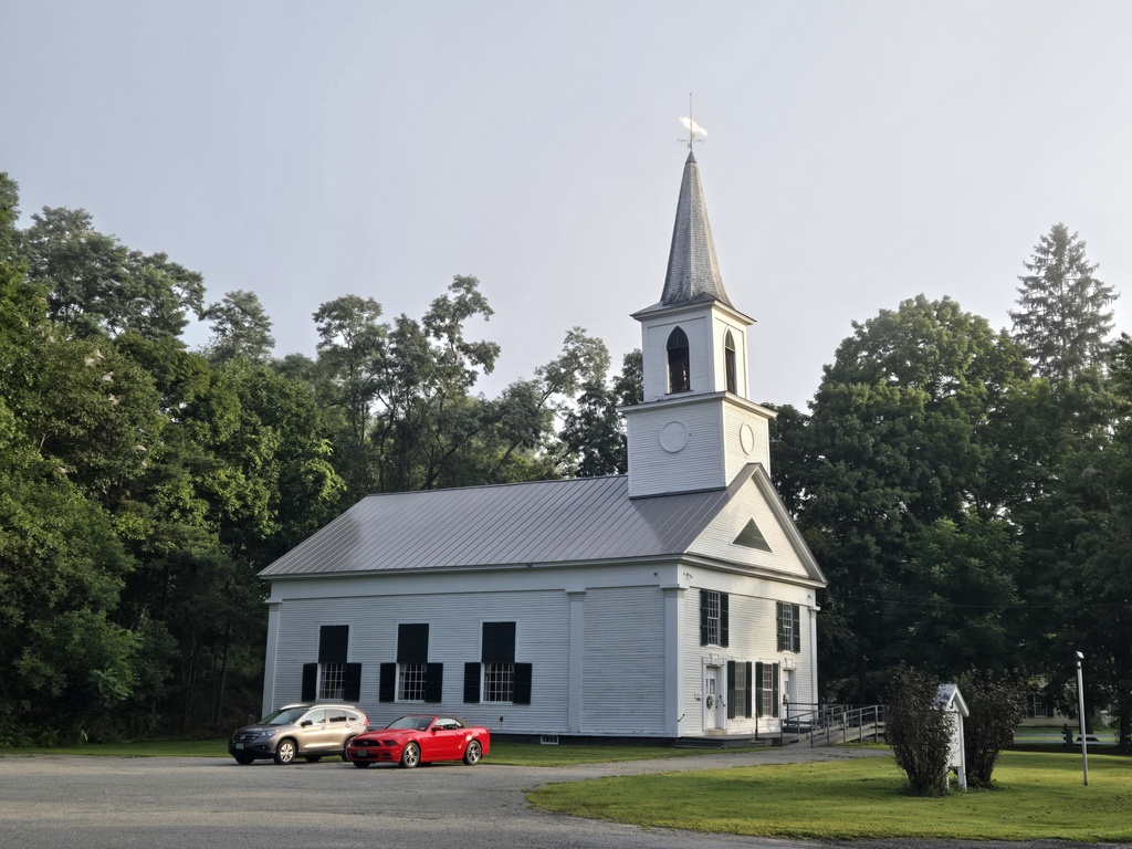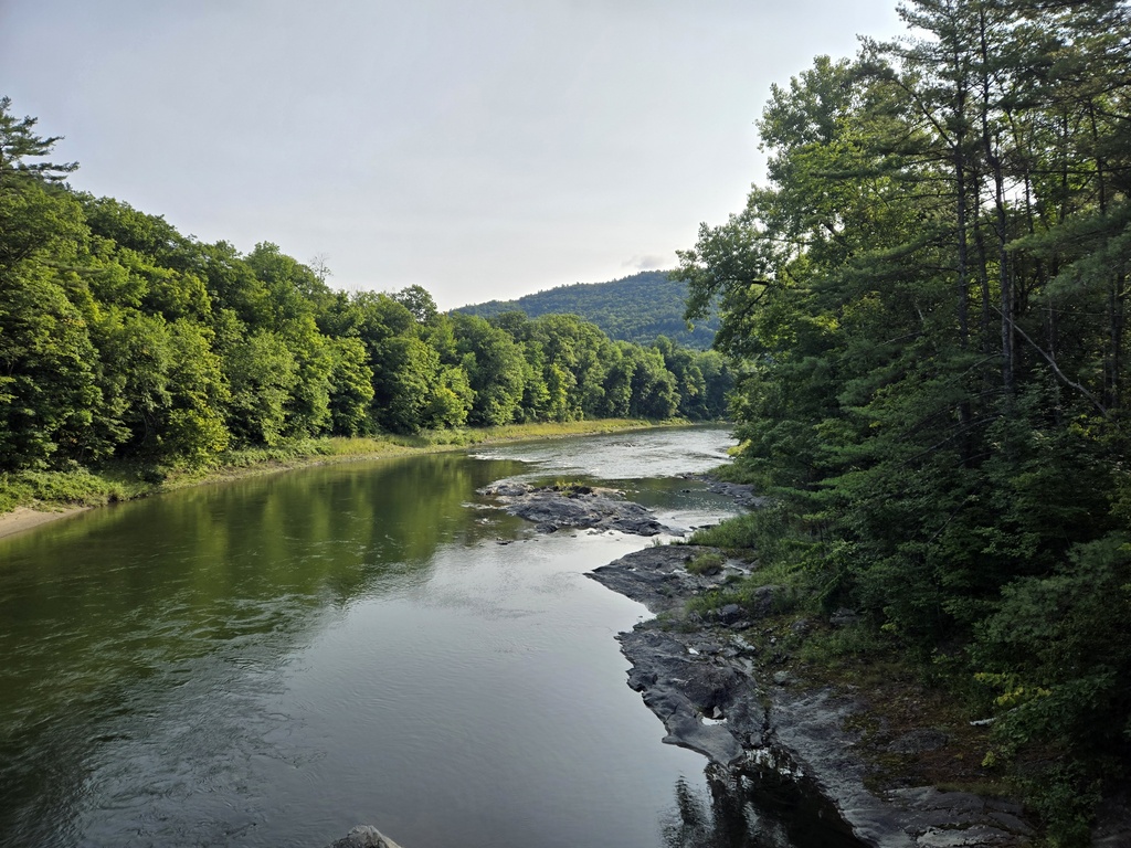 We rode down river from South Royalton to our first challenge of the day, a super steep 4 mile climb out of the town of Sharon. Just to get us fully psyched for the climb a flagger stopped us at the bottom right where we could see the really steep opening quarter mile looming over us. They held us there for about 20 minutes. They were re-paving the uphill lane and it was closed so they had one-way traffic moving in the downhill lane. We started at the end of the cars going up and it seemed that they would hold traffic until we cleared their job site. We were only half right as they did hold the traffic but they did not hold the three project asphalt dump trucks. The first one passed us a too close while we were pushing hard to get out of everyone’s way. Yes, it is quite fun trying to sprint a mile uphill at 10% with fully loaded touring bikes. It was hard but at least the paving bunched up the traffic so we rode most of the rest of the climb traffic free, except for a couple bunches of cars. It turned out to be the hardest climb of the day, and most drama filled as well.