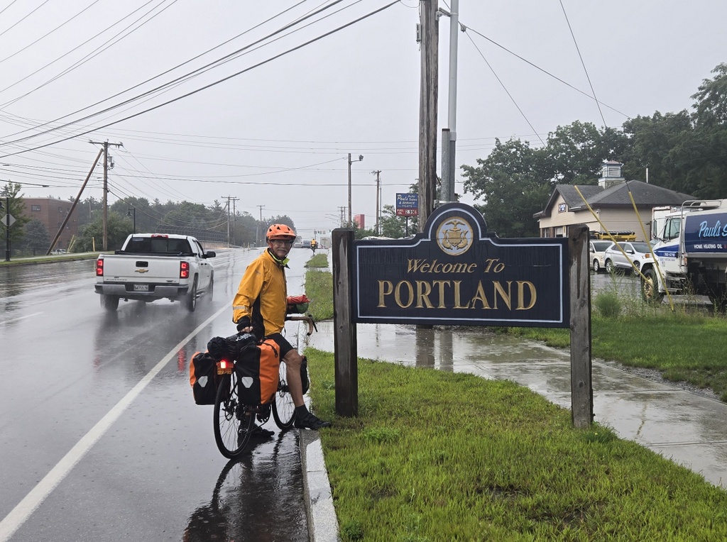As we got closer to Portland we could see the storm clouds behind us. A lady who was working in her yard said “looks like the storm is chasing you!” We stopped 12 miles from the end for a quick break and it caught us – we were rewarded with thunder, lightning and a downpour. I didn’t think the rain was going to stop so I advocated to push on. I’m not sure this was the wisest decision as the rain increased in intensity and the Portland bike route left something to be desired. A few miles from the end the rain stopped and we were able to get pictures by the bay without the rain.