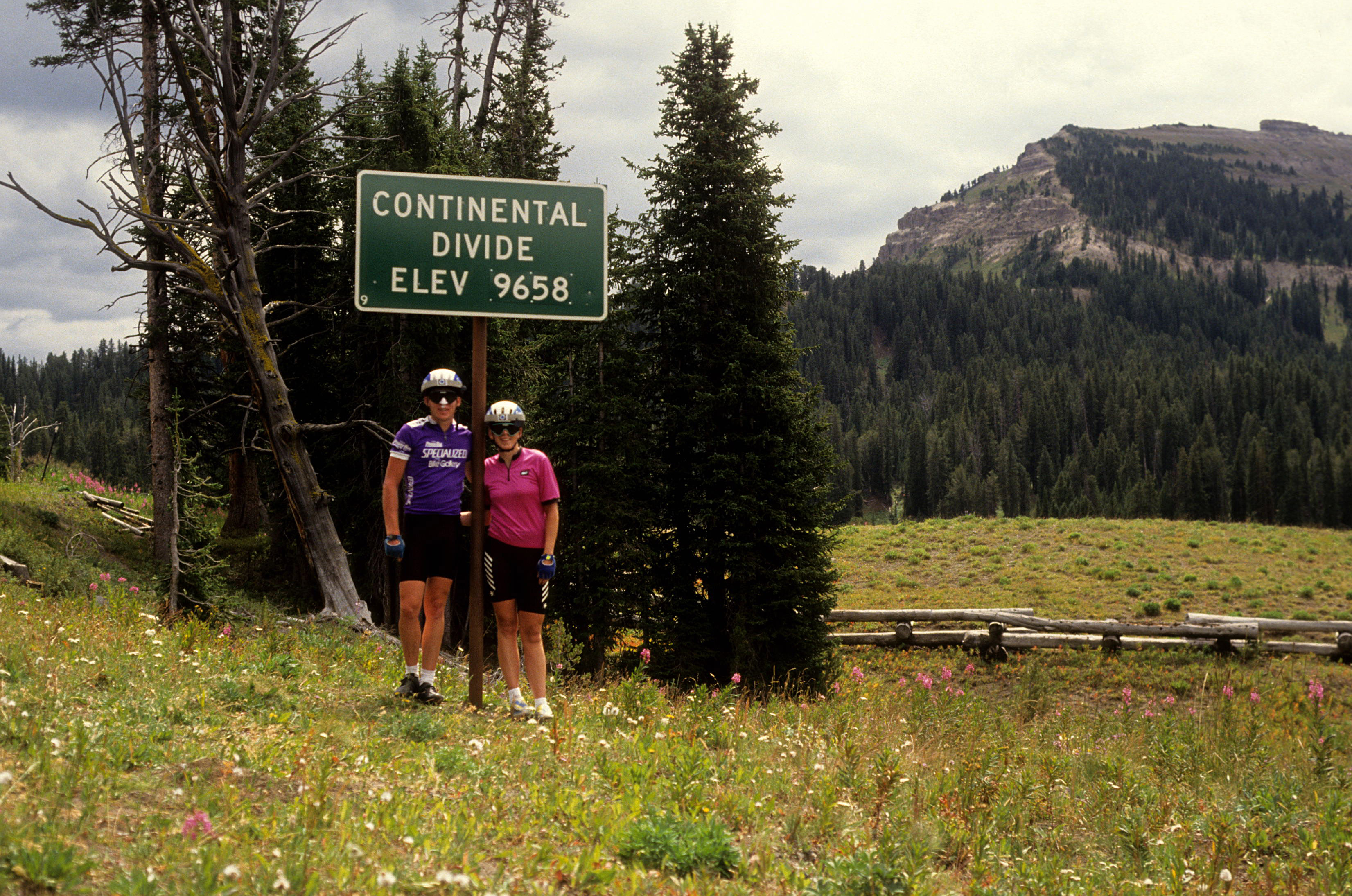 After lunch we started to climb Togowotee Pass. It was a very long climb, somewhere around 17 miles of climbing. It got pretty steep at spots but leap-frogging the RAW riders made for a good distraction. And the scenery was very nice. The elevation at the top was 9668, our highest point of the trip so far. It was also our first time crossing the Continental Divide. I don’t think the pass elevation sign are correct. It seems that some states might exaggerate pass signs to “outdo” their neighbors. Our bike computer was almost 100% accurate whenever we were at a town, be it sea level or in the mountains. Yet at the top of ever pass, we were always a couple 100 feet lower than the signs list elevation. Dave called it “neighbor-state pass envy”. Either way, they are all hard to ride up with a loaded tandem!