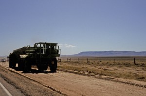 Next stop was Jeffrey City. On the way there we had to ride through some road construction. Make that road destruction. They don’t just patch roads out here, they nuke them. While all the big trucks were up on the road, we got to ride on a temporary road made of soft sand down off the side of the embankment. This went on for about 9 miles. I’m not sure how Dave kept us from crashing a couple times, as the steering was very iffy. A couple times we had to simply carry the bike, as it was even too hard to push. At some places the temporary road was one way with flaggers and follow cars. There was only room for traffic one way, as there were large mounds of dirt on both sides. At one section the flagger on our side must not have told the flagger on the other side about us at the end of the line, as he started bringing cars back towards us before we reached the end. We had to lift the tandem over a huge pile of dirt to get out of the way, ending up on the new road. When the supervisor drove up in his air-conditioned truck and told us we were not allowed up there, I pretty much lost it. I’m sure he could not hear Dave or I yelling over the heavy trucks but we let him have it. He listened for a while then told us to be careful and just drove away.