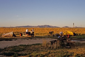 It was 30 miles of downhill to Dubois. Only trouble was that we had a strong headwind. Near town we got really blasted a few times, including some sand to make sure we got our money’s worth. We made it to camp just short of a century again and pretty darn tired. We set our tent near the RAW group so we got to swap bicycle stories before dinner. A little later a group of 2 German and 2 Belgian riders rolled into camp. Again, the number of cyclist sleeping in the park probably dwarfed the size of town. We should sleep well tonight as today was long day.