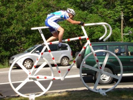 The ride back was mostly downhill, nice. We stopped on the edge of Briancon for silly photos at the large ornamental bikes they have up for the tour. Ross and Dave made fools of themselves by climbing onto the seats. Passing traffic seemed to get a real kick out of the Aussie fools!