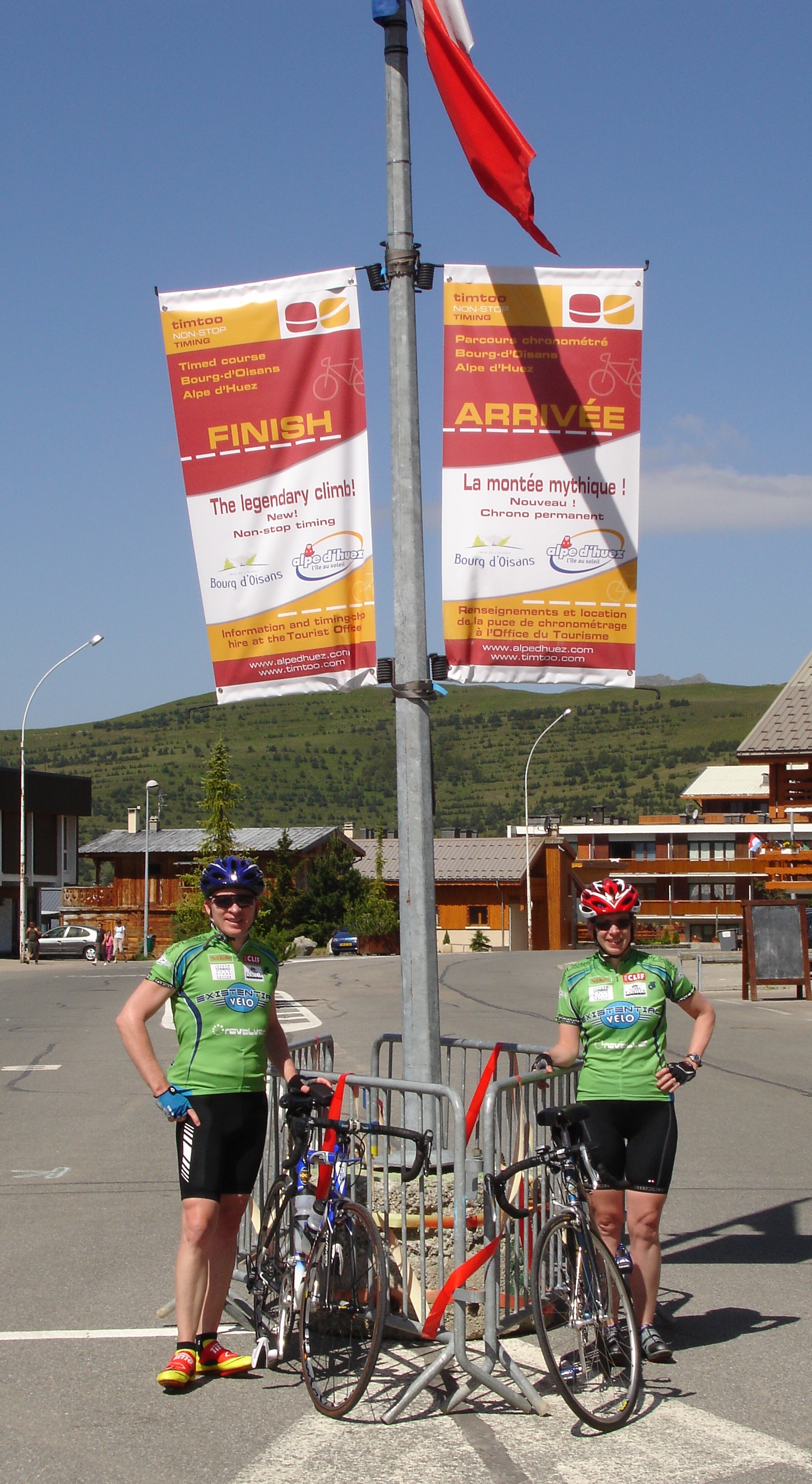 We took a deep breath and started the climb. We had read that the first 3k were pretty tough, and for sure they were. At least 10% for the whole 3k – it was rough, even with the switchbacks. After that it eased up a bit, still hard but at least seemed possible. The numbered switchbacks were a nice diversion – they each had a name of a tour rider who had won an Alp d’Huez stage. Plus, they started at 21 and decreased as you went up so it at least made you feel good to see the numbers going down! There were a few flat spots in the middle to give you a breather as well. We finally made it up to the village at the top, but the signs indicated the tour finish was up another few turns so we kept going all the way to the top. Many riders stop at the last village, and Jeannette and Ross, who were behind us, stopped there but of course we couldn’t do that! We made it to the official finish line and got someone to take a picture of us to prove to Andy that the Existential Velo jerseys made it to the official top of Alp d’Huez!