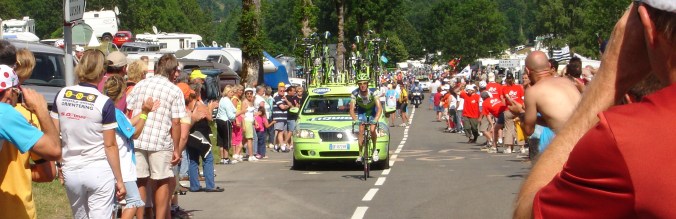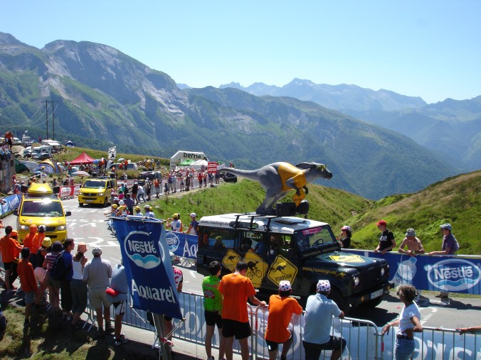 It was a very long descent of the Port de Bales to the start of the Col de Peyresourde. We had to ride up to the Thompson Bike Tours tent, which was set up 5ks from the summit. We certainly weren’t riding alone, being a finish climb meant the road was lined with lots of people. We arrived at the tent pretty early and ended up having over 5 hours to watch the tour caravan, race vehicles, leading riders and the tailend sprinting grupeto. Dave managed to grab some more swag from the caravan, this time not taking out as many kids.
